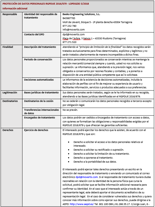 Se informa que los datos pueden ser tratados con la finalidad de facilitar información de nuestros productos y/ o servicios por medios electrónicos, siempre que nos autorice a su tratamiento. Sus datos podrán ser objeto de la elaboración de perfiles, con el fin de aplicar un plan de fidelización de acuerdo a la vinculación comercial del cliente y ofrecer ofertas que sean adecuadas a sus preferencias. Usted podrá en cualquier momento oponerse a este tipo de comunicaciones, enviando un correo electrónico a la dirección info@movertis.com e indicando en el asunto